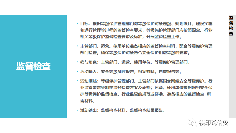 监督检查阶段需要输入包括但不限于安全等级测评报告、备案材料、自查报告等,等级保护管理部门、主管部门依据国家网络安全等级保护、行业监管要求等制定监督检查方案及表格;运营、使用单位根据网络安全保护等级保护监督检查、行业监管的规范或标准,准备相应的监督检查所需材料,等级保护管理部门对等级保护对象定级、规划设计、建设实施和运行管理等过程的监督检查要求,等级保护管理部门应按照国家、行业相关等级保护监督检查要求及标准,开展监督检查工作。最终由监管部门输出监督检查材料、监督检查结果报告等。